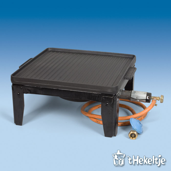 Exclusief gas. De benodigde gasfles (voor circa 10 uur gebruik) wordt automatisch bijgevoegd en berekend als u de bakplaat besteld.